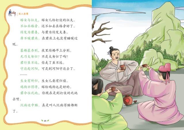 下面这一页便是《杜甫》一书中有关《新婚别》的介绍,图文并茂,文白对照,让孩子看得一目了然。