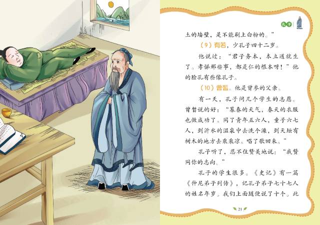 这套书在原有民国纯文字书的基础上,加入了精美插图,让图书更适合当代的小朋友阅读。请看下图中,孔子说他的学生宰予白天还睡觉,简直是“朽木不可雕。”宰予的小懒样儿,是不是很呆萌?