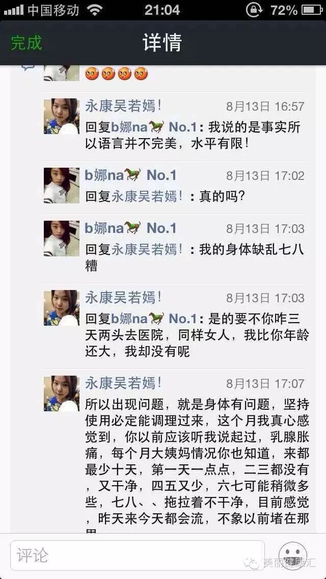 首先非常明确的告诉大家,我也是产品的真正受益者,我们公司所有的经销商都是产品的受益者!我是因为年轻的时候不懂事,做过流产后就开始有各种妇科疾病的困扰,《月经量少,痘痘,最严重的霉菌阴道炎》月经跟痘痘不影响正常的生活,我都不太重视。可是霉菌阴道炎反反复复发作,几乎每个月都要到医院去报告一次。有过霉菌的朋友都知道,霉菌特别痒,特别影响夫妻生活,也是最容易反复发作的一种妇科疾病。同房特别尴尬,到医院反复治疗无果,记得最后一次拿这个(妇宝宁)用的时候还是在医院烤红光的病床上,我也是抱着试试看死马当做活马医的心态来用产品的。那个时候也有在想这东西如果真的这么好还要医院干嘛?使用中间也有出现一些调理反应,也有不相信,抵触,因为用了七支凝胶的时候月经提前半个月,并且流了半个月!我的老师格格跟我的闺蜜告诉我是因为我气虚肾虚导致的月经提前,气不固血导致的月经拖拉半个月。那时候哪里听得进去,总以为毁了~~