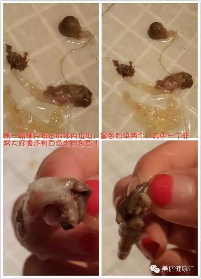 大家能够看到上面2014年8月13号我用产品出现调理反应在闺蜜朋友圈评论的,内心是很多的抵触,这个闺蜜她是因为乳腺胀痛,月经拖拉用的产品,她吸收特别好,当月就见效了。当我持续半个月的月经干净后,其实我有感觉,这次月经虽然提前了,时间久了,但是颜色似乎鲜红了许多,最重要的是月经过后不痒了!!!我这个人也比较持家吧,哈哈~花了钱一定花在刀刃上,不能浪费,1260一套买来的,放着不用浪费了,我就月经干净后第四天用了一颗(妇宝宁)第三天晚上拉出来的时候实在让我惊呆了,好恐怖【下图】