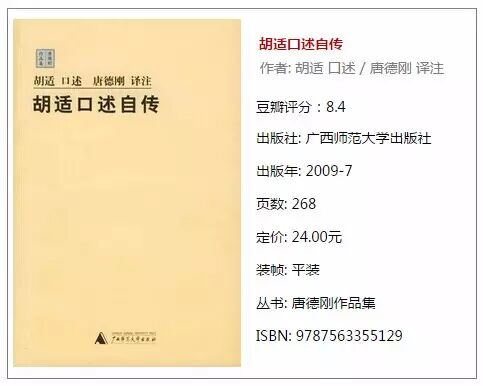 ►在这里,胡适重点对自己的一生的学术作总结评价,而这评价反映出胡氏晚年的思想与他中少年期的思想简直没有什么出入。唐德刚将其英文口述译为中文后所作的注释评论,却是不可不读的好文章。这本书“传”与“注”已成为不可分割的整体,就学术价值和史料价值而言,注释部分的分量,恐怕还在传文之上。1970年代,海外史学界盛称《胡适口述自传》:“先看德刚,后看胡适。”