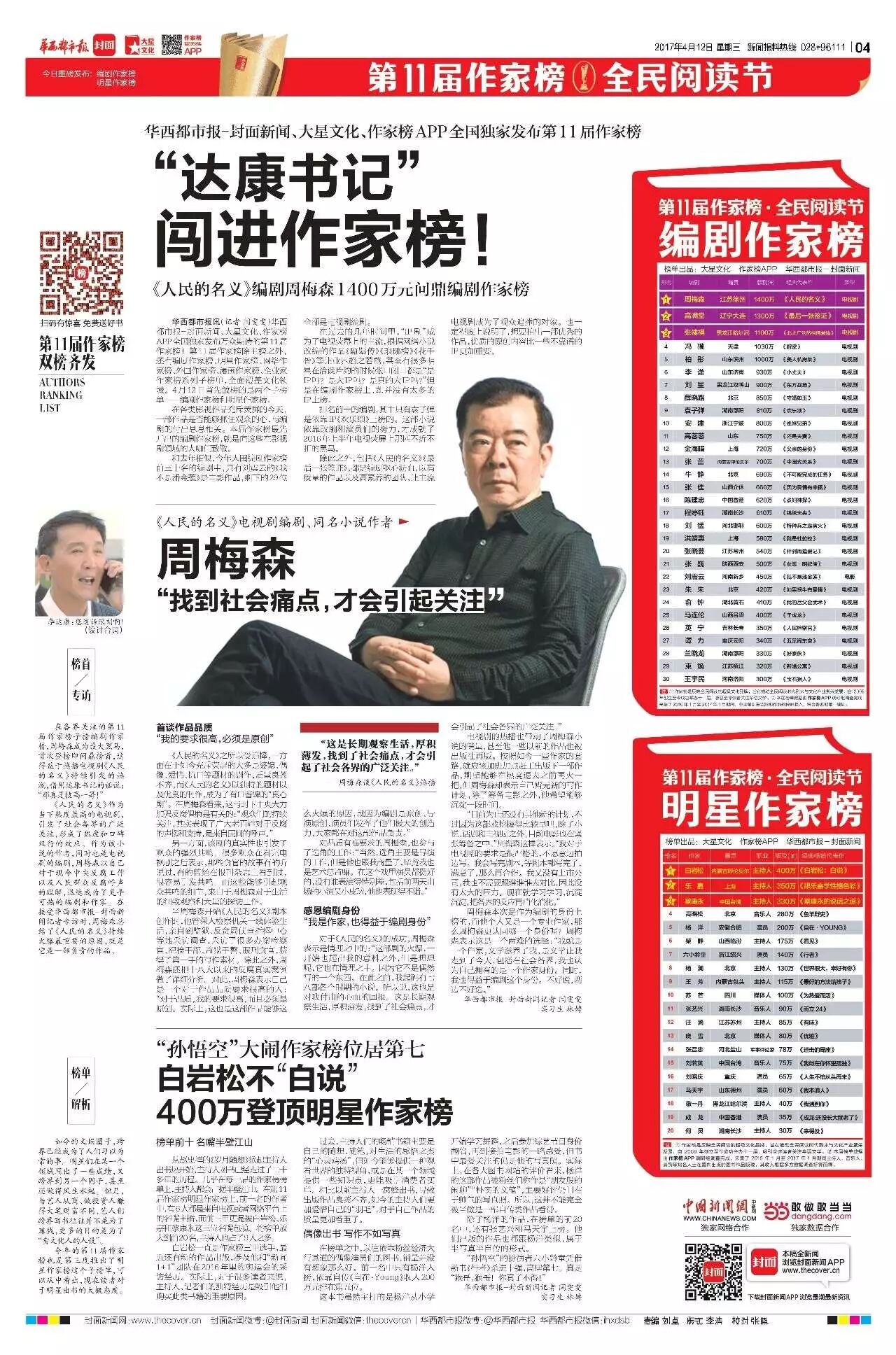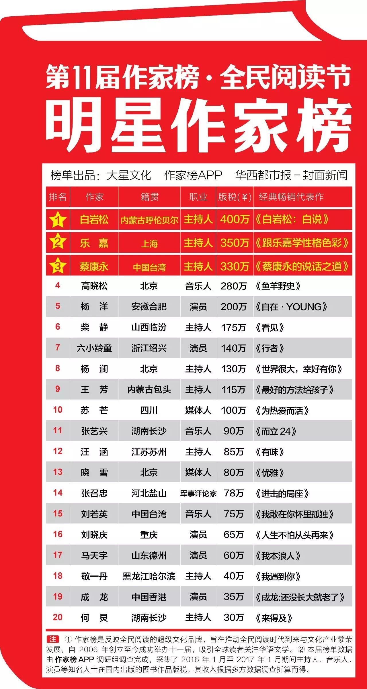 华西都市报讯(记者闫雯雯)华西都市报-封面新闻、大星文化、作家榜APP全国独家发布万众期待的第11届作家榜!第11届作家榜除主榜之外,还有编剧作家榜、明星作家榜、网络作家榜、外国作家榜、漫画作家榜、企业家作家榜系列子榜单,全面覆盖文化领域。4月12日首先放榜的是两个子榜单——编剧作家榜和明星作家榜。