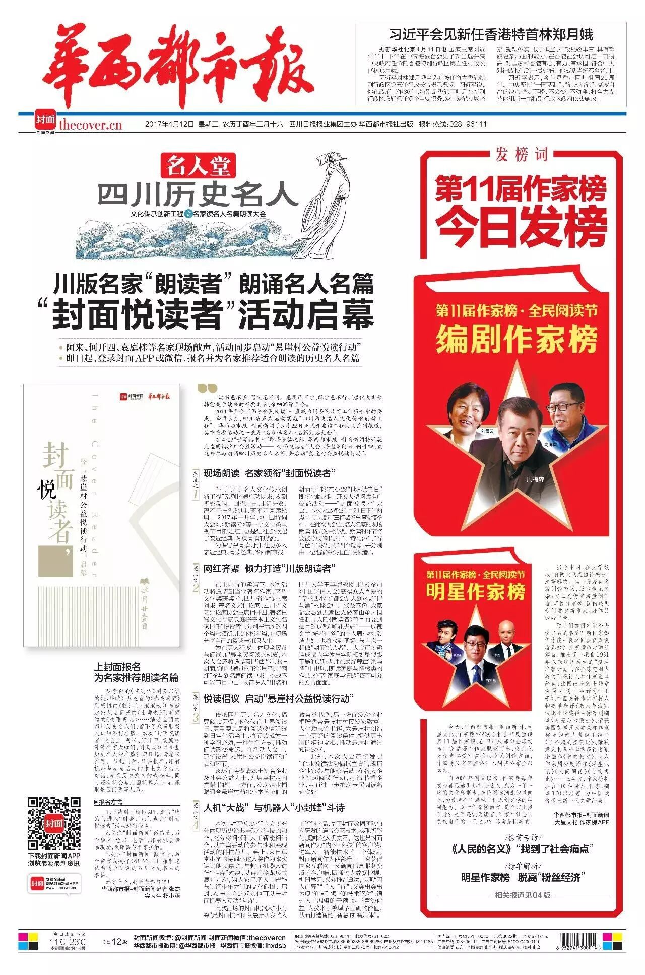 今天,华西都市报-封面新闻、大星文化、作家榜APP联合推出年度重磅第11届作家榜,在四川成都向全球发布!究竟哪些作家脱颖而出,受到亿万读者喜爱?在推动全民阅读方面,作家榜又有何盛举?本周将公布全部答案。
