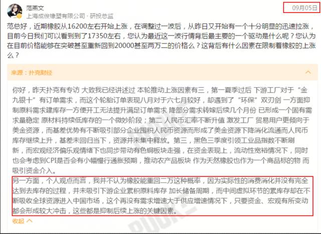 以上的产业分析与知识分享,在扑克财经App问答社区,橡胶界知名投研咖范燕文女士多有分享。9月初,在市场沉迷于争论是否上20000点的时候,范总已经多次提醒,17500可以尝试沽空。