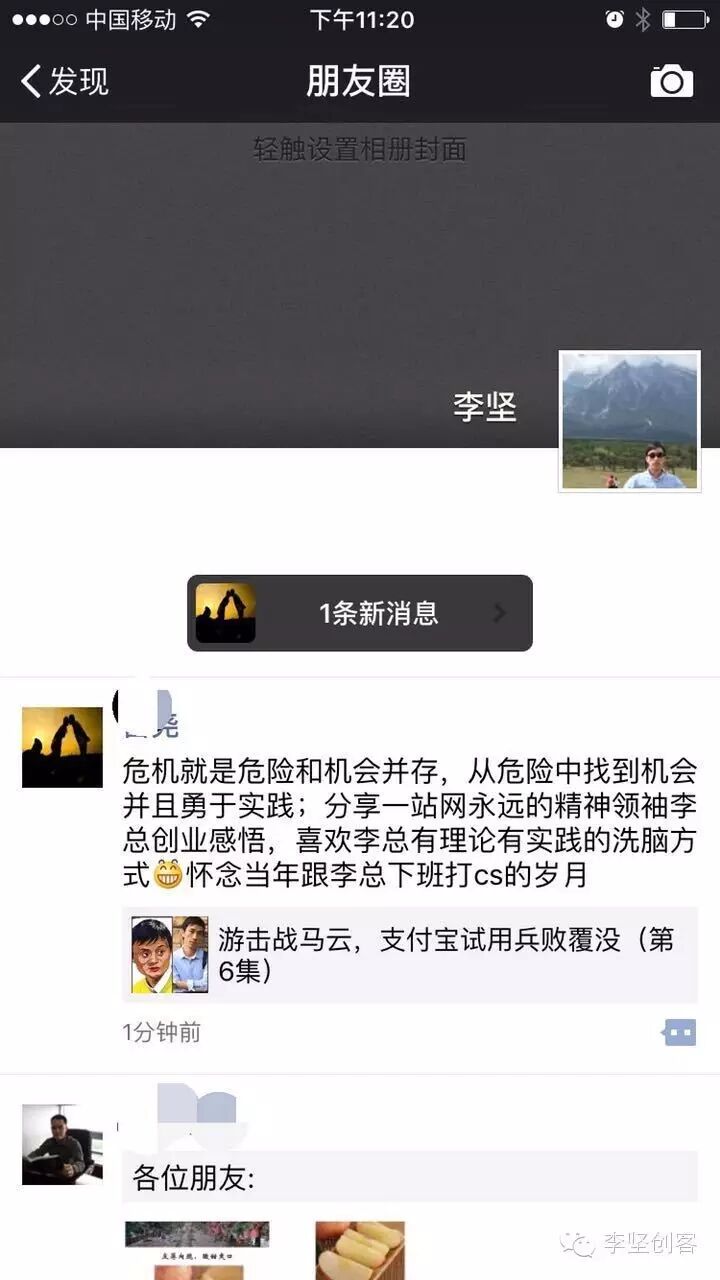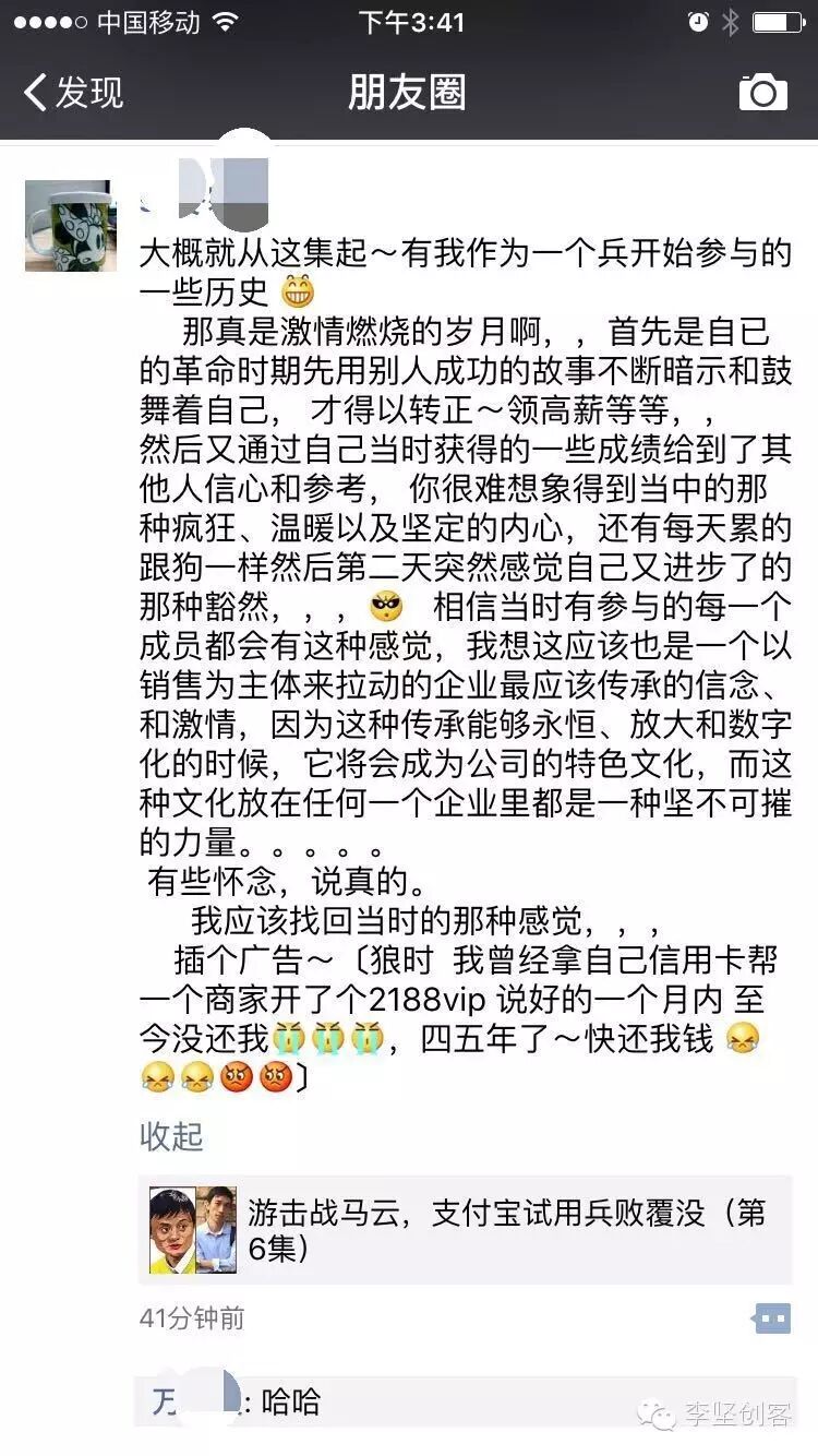 A呀,没注意考虑到朋友圈里也有马总的粉,上一集真是对不住了;经常有朋友问到我现在的一站网状况怎么解?我想说的是企业无论在什么阶段都会有问题,有问题自然也会有解决问题的方法,只是人不同,方法不同而已嘛,都会过去的!