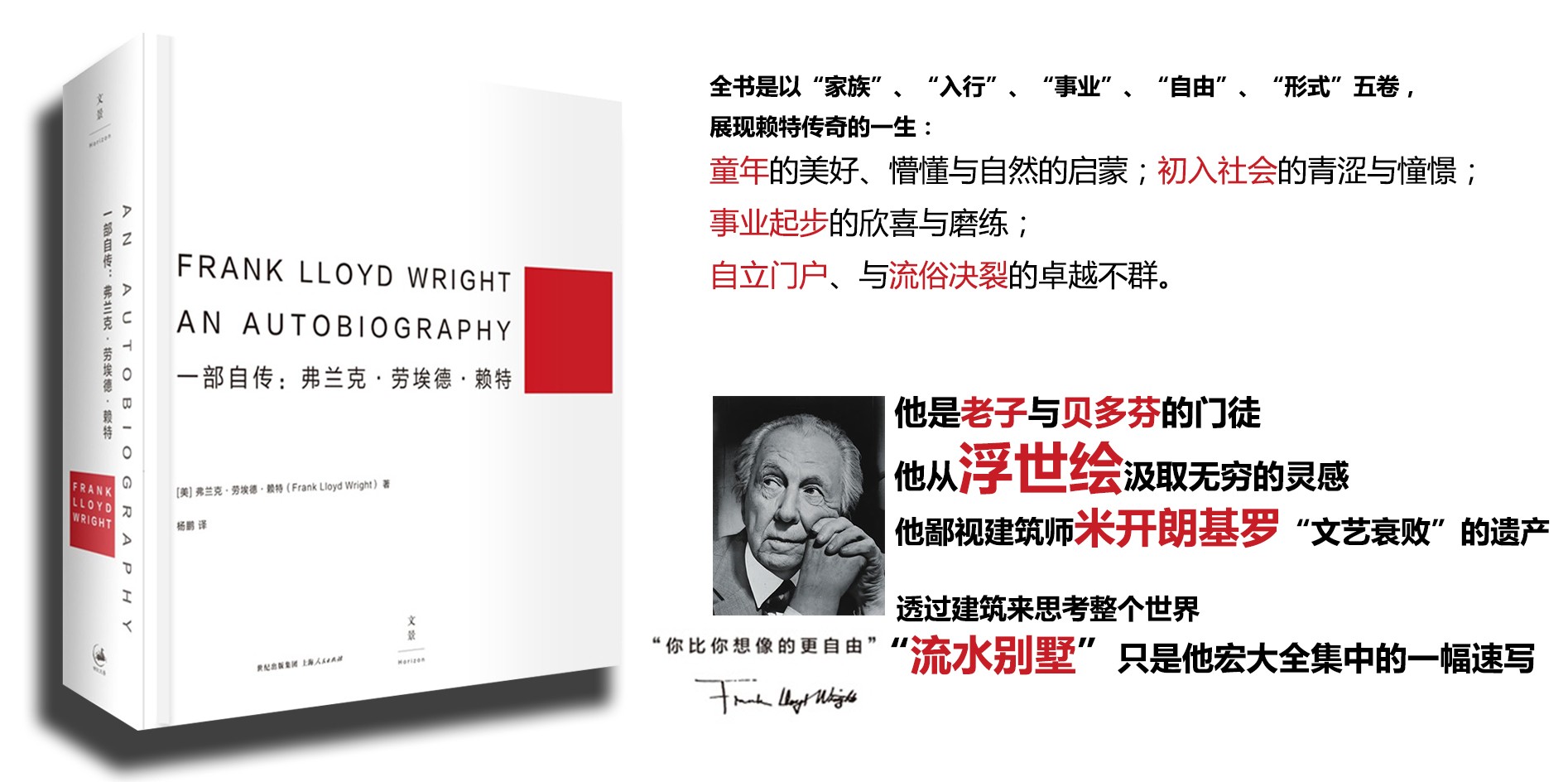 经历了近一个月认真挑选和准备,AC传书第一传首先为大家隆重的推荐这本美国建筑大师弗兰克·劳埃德·赖特的自传。一部自传,总是人格最成熟时的产物。在赖特优美流畅的文字与奇巧清新的哲思中,我们可以窥见一名建筑大师的成长历程,以及整个建筑界的起落沉浮。同时,也可以感受到美国社会以及整个时代的风云变幻。