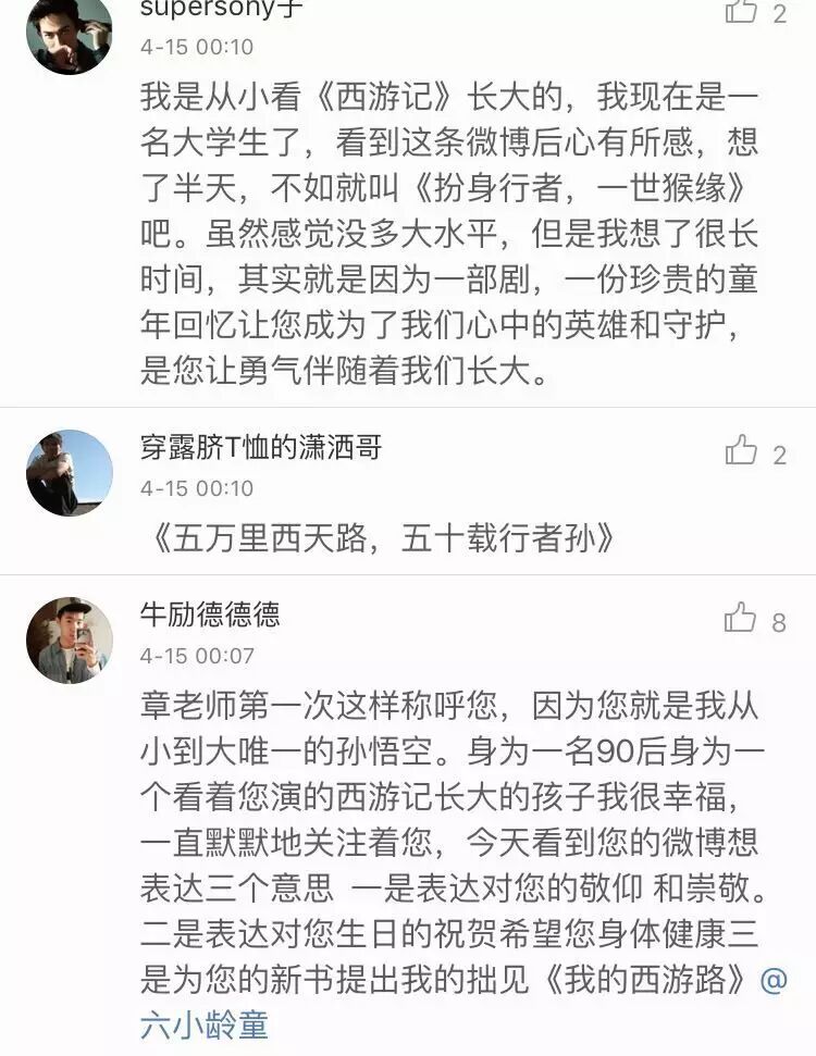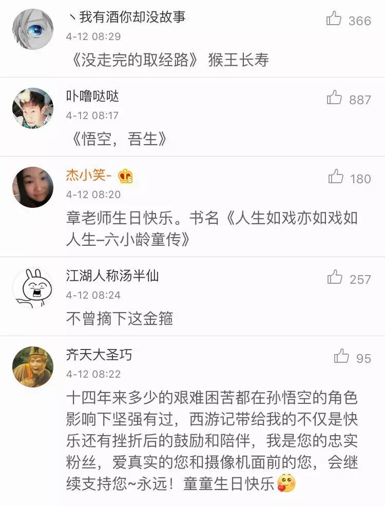 喂喂,大家都太狡猾了吧……不光起书名,还纷纷趁机向六小龄童表白!所以,六小龄童赶紧贴出他们夫妻俩的照片,说:“我的生日你陪伴:我俩谁演猴王好啊?”……真是晒得一手好恩爱!单身狗表示,被虐到了啦!!!