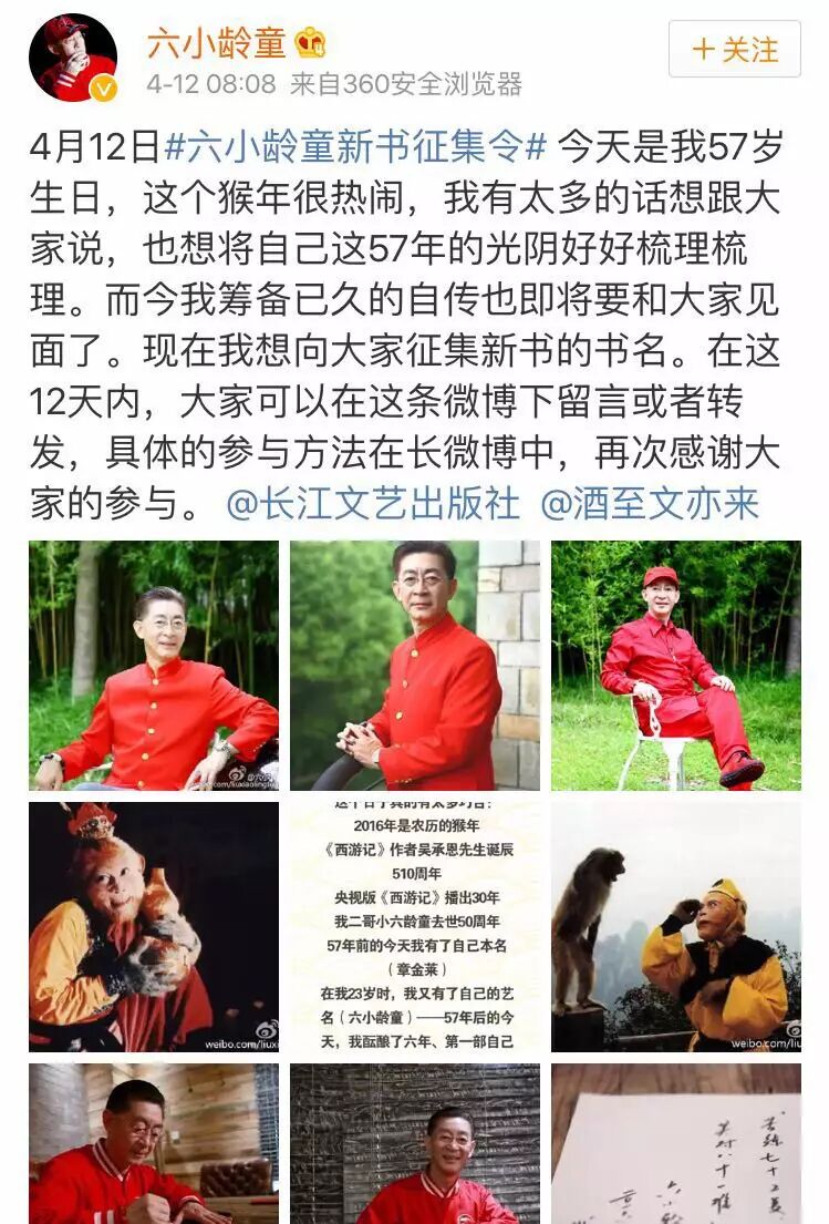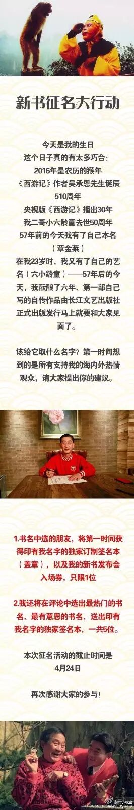 趁着征集书名的截止日期4月24日还没到,您要不要也给六小龄童出个主意?没准儿他的自传书名,就出自您的手笔呢!