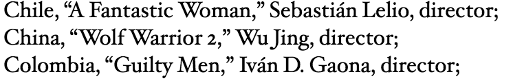 德国则选择了法提赫·阿金的《凭空而来》,本片同样入围今年戛纳电影节主竞赛单元,并助戴安·克鲁克获最佳女演员奖。智利《普通女人》,以色列《狐步舞》,黎巴嫩《羞辱》也都有机会获提名。