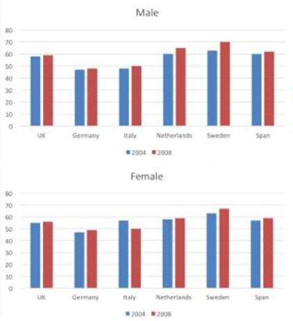 It is noticeable that male’s retirement age rose in the four years in all countries, among which Netherlands and Sweden witnessed a relatively considerable rise, while the rest of countries increased slightly. The male Swedish and Dutchmen retired at the latest age of 70 and 65, whereas male Germans and Italians enjoyed their retirement much earlier( 48 versus 50).