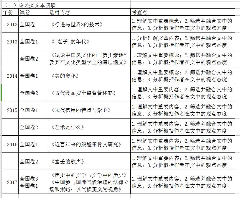 从2012年到2017年,论述类文本都是全国卷试题的必考内容,设置三道小题,均为客观题,每小题3分,共9分。选材一般是社会科学类文章或自然科学类文章,内容涉及政治经济、历史文化、文学艺术等,注重人文科学知识的传播,凸显其文化含量、人文价值、教化作用。选文一般在1000字左右。