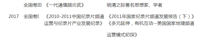 2015年和2016年,全国I卷是史学论文,全国II卷是文艺论文;