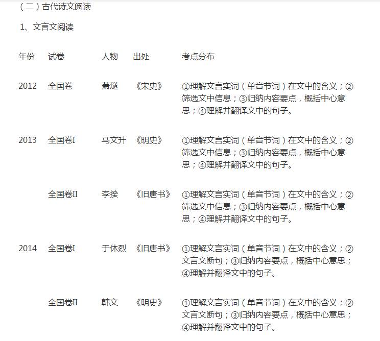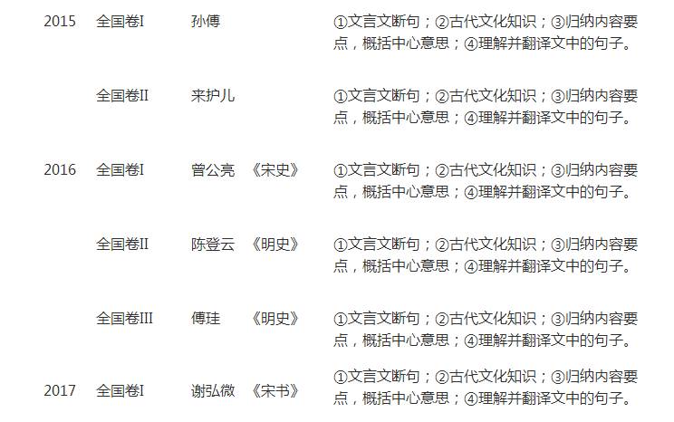 从2012年到2017年,文言文阅读试题一直保持比较稳定的态势,以客观题和主观题的形式进行考查。该题分值基本保持在19分。约占高考语文试题总分的12%。其中客观题3小题,每小题3分,共9分;主观题为翻译题,包括两个小题,每小题5分,共10分。阅读文本均为人物传记,字数大约在600—700字,涉及的人物大都是忠臣良将或在某一方面有建树的人物。