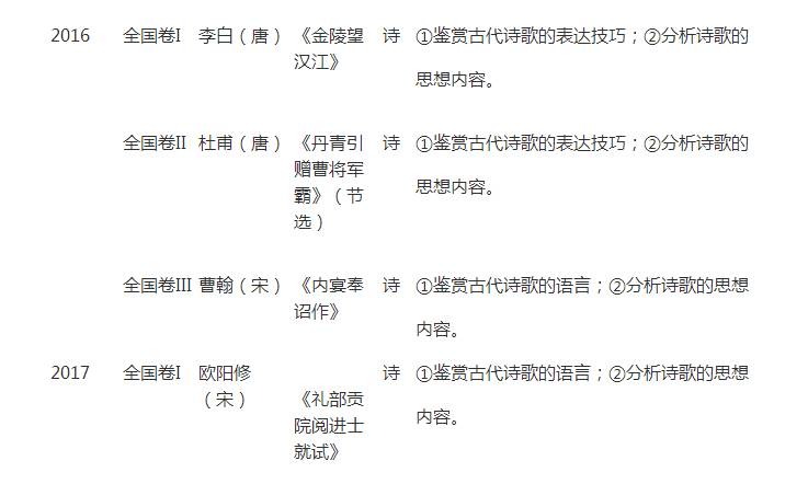 2016年全国II卷节选了古体诗中的八句。太短和太长的诗歌均不便于考查考生的理解能力,也不便于试题的命制。其最主要的变化是2014年出现了两首诗歌进行比较鉴赏,2015年和2016年与课内诗词结合考查,既考查考生对教材理解的程度,又考查考生对教材要求背诵的篇目记忆的熟练程度,还考查比较鉴赏古代诗歌的能力。两道试题的考点分别涉及诗歌的思想内容、艺术特色、语言风格,其中分析作者的思想内容、鉴赏表达技巧(表现手法)是高频考点。此类试题需要考生在整体理解诗歌的基础上准确答题,单纯的背诵答题公式和术语无济于事。