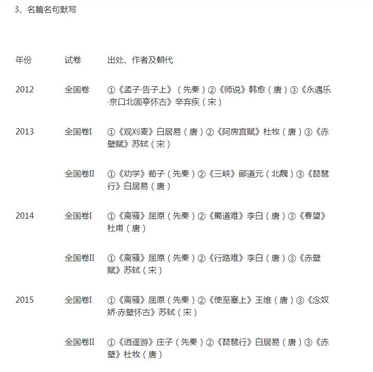 近六年考查的名句多出自先秦和唐宋作品,先秦是百家争鸣的时代,散文思想性强;唐宋诗词和散文俱佳。