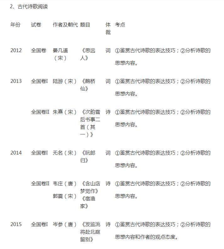 《考试说明》对诗词鉴赏的总体要求为:鉴赏文学作品形象、语言和表达技巧;评价文学作品的思想内容。近六年的古代诗歌鉴赏试题,选材范围非常广泛。但从整体上看,仍然以唐宋诗词为重点,名家名篇相对减少,考生不熟悉的作品比例大,名家的非名篇和非名家的名篇所占比重不断加大。题材上突出写景诗和咏怀诗,篇幅上是短篇,即是律诗或者双阕的词。