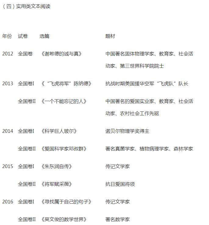 从命题形式上看,近六年对实用类文本的考查相对稳定,在文本的选择上,所选的文本均为传记,且传主都是在社会科学或自然科学方面的现当代名人。从文本内容上看,从2013年开始有一个小的变化,就是正文后增加一些与传主相关的链接材料,对文本进行恰当的补充,有些题目的答案就渗透在这些链接内容里。从题型看,第(1)题是五选二的客观题,分值为5分,第(2)(3)题是主观题,分值均为6分;第(4)题是围绕文中某一信息所设的探究题,分值为8分。